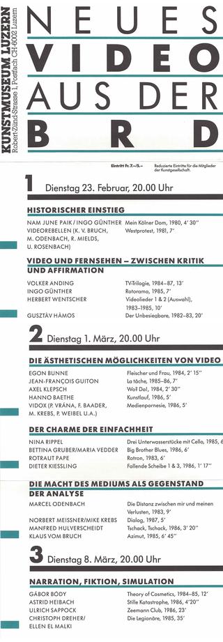 Neues Video aus der BRD. Catalogue of Video program, Museum für Gegenwartskunst, Basel, 1987, Kunsthaus Aarau, 1987. Texts: Dieter Daniels, Jörg Zutter, and Markus Landert. (The program was shown at Kunstmuseum Luzern, 1988). Basel: Öffentliche Kunstsammlung Basel, 1987.